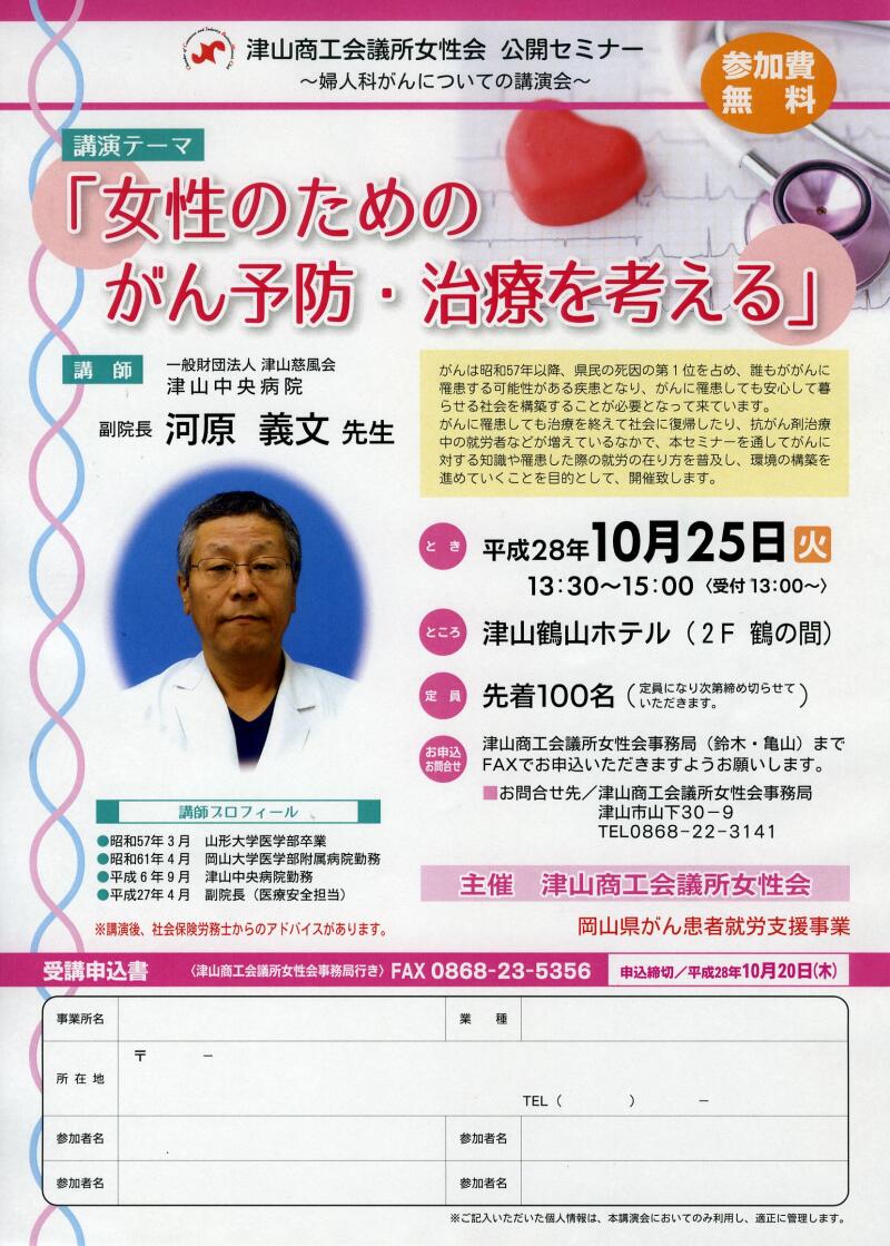 総務環境委員会(千代延綾子委員長)主管により、「女性のためのがん予防・治療を考える」と題して、河原義文氏(津山中央病院副院長)を講師に迎えて公開セミナーを開催しました。