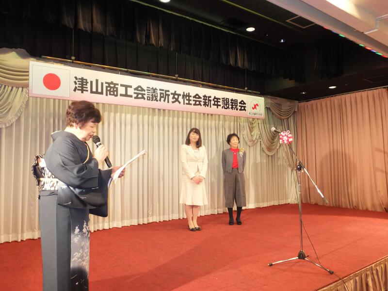 松田会頭からは、「時代の移り変わりが目まぐるしい昨今、それを読み取って対応していくことの必要性と女性の力の大切さ」についてお話しいただき、浮田副会頭からは女性会の健闘を讃えていただきました。竹内青年部会長の乾杯で祝宴が始まり、恒例の3部会の余興では笑いが起こり、来賓によるカラオケ、新入会員の紹介、「和っしょい!津山」の総踊りで締めくくりました。中女連津山大会に向け、益々の一致団結を感じる新年懇親会となりました。